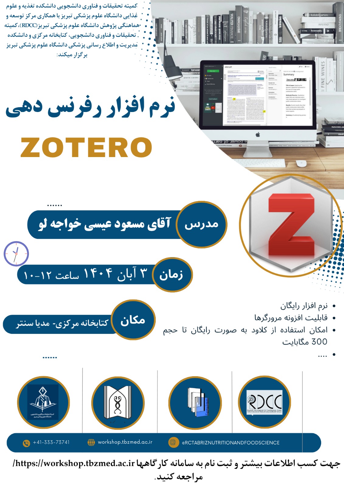دانشکده مدیریت و اطلاع رسانی پزشکی با همکاری مرکز توسعه و هماهنگی پژوهش دانشگاه و کتابخانه مرکزی اقدام به برگزاری کارگاه "کارگاه آشنایی با نرم افزاررفرنس دهی Zotero" ویژه اعضای هیئت علمی، محققین و دانشجویان در تاریخ ۳ آبان ماه خواهد کرد. برای ثبت نام و دریافت اطلاعات بیشتر به وب سایت